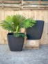 Square tapered in pots in rough stone finish.